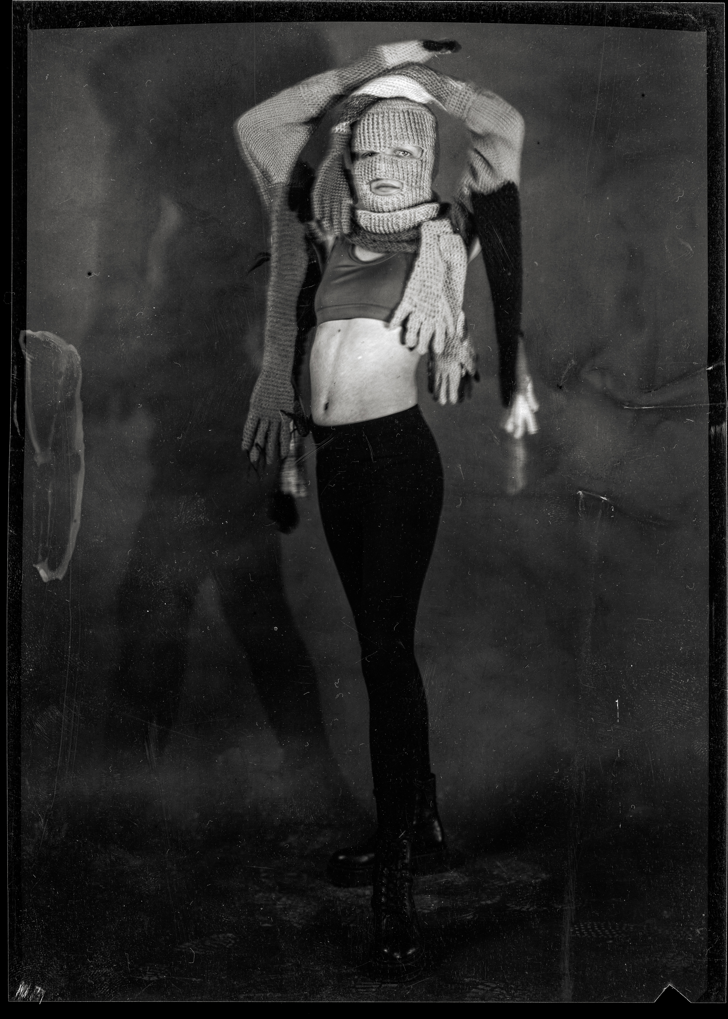 “The crocheted mask, made by my mother, connects to intergenerational female knowledge. The body is formed by a wearable garment created by Syster Hysteria to accompany the mask. The knitted shrug top—evoking multi-armed pagan goddesses—together with the mask reclaims several ritual codes.